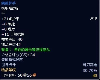 物品等级 45 拾取后绑定 皮甲 手 12 护甲 +8 敏捷 +8 耐力 +8 爆击 +9 自然抗性 <随机附魔> 耐久度 50 / 50