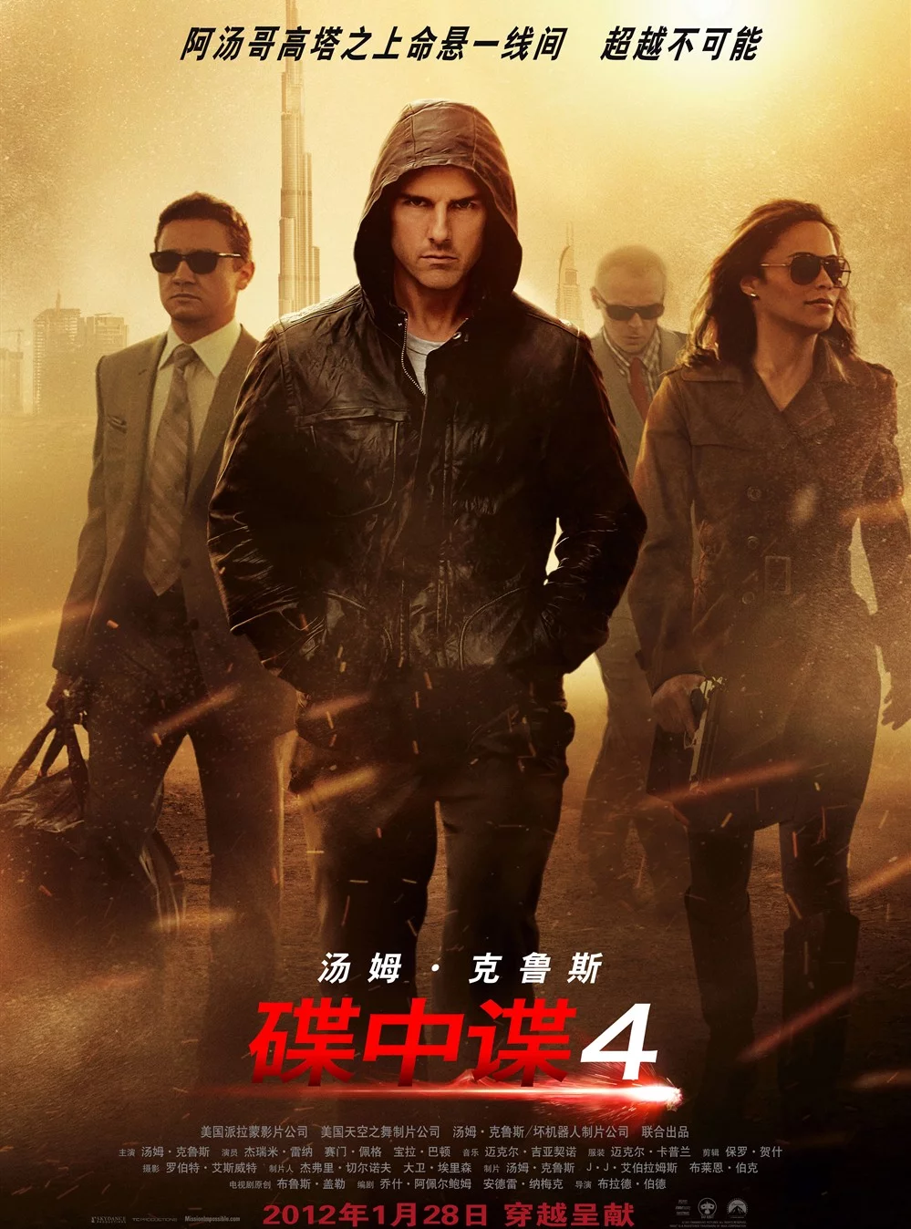 《碟中谍4》是由派拉蒙影业公司于2011年12月16日(北美)发行的一部动作谍战类影马丰希期胞洲飞片。该片由布拉德·晶做比渐树田于容伯德执导,安德来自雷·纳梅克、乔什·阿佩尔鲍姆共同担任编剧。汤姆·克鲁斯、杰瑞米·雷纳、西蒙·佩吉、乔什·哈洛威、文·瑞姆斯、宝拉·巴顿等主演。