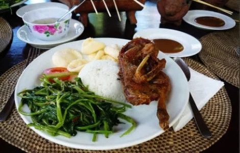 全巴厘岛以乌布的脏鸭餐最出名,因360百科为这里被大片大片的稻田环绕,水质好,鱼虫多,鸭子长得肥美。脏鸭餐是好几种小菜搭配的套餐,放在翠绿的芭蕉叶上,颜色就让人食欲大增:半只鸭子烤成棕色,用手一撕,酥酥脆脆的,放进嘴里却没有太油腻的感觉;更难得的是,丝毫没有鸭腥味。原来是烤制之前,会用由多种本地香料特制的"秘汁"腌45分钟,彻底去除异味。