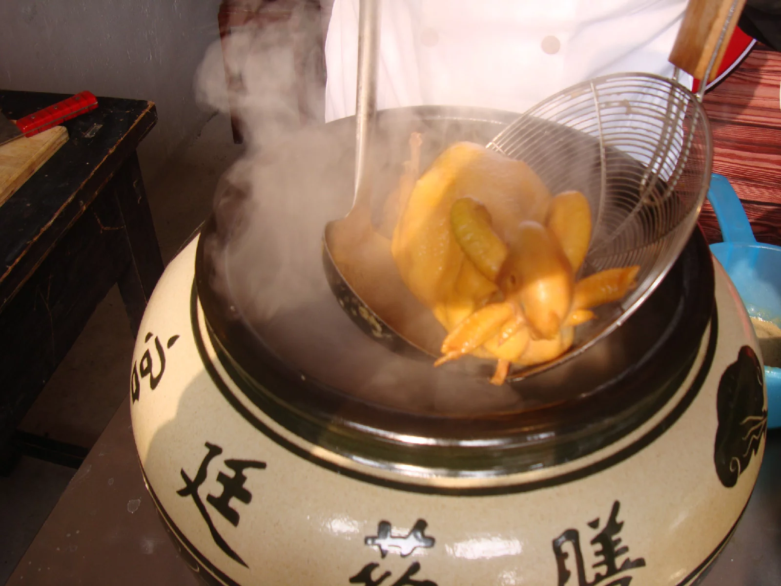 将坛密封,小火4小时,封火,再焖3个小时,共计7个小时,开封、出坛,其色金黄玉润,晶亮养眼,其色纯正持久,不闷不腻,入口细品,皮脆肉嫩骨酥,满口溢香。坛子鸡还因为中药秘方的卤制,有活血舒筋,清肺、健胃之功,尤为适合老人和小孩。