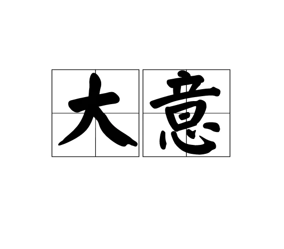- 大概的意思;要义。《管子·宙合》:"苟大意得,不以小缺为伤。"北齐 颜之推 《颜氏家训·杂艺》:"粗知大意,又不委曲。"宋 苏轼 《礼以养人为本论》:"夫礼之大意存乎明天下之分,严君臣,笃父子,形孝弟而显仁义也。"《东周列国志》第一百六回:"书中大意云:'某久有史听关古静权献城之意,奈不得其便。然赵量王已十分畏惧,倘得秦王大驾亲临,其当力劝赵360百科王行衔璧舆榇之礼。'"蔡东藩 《清史演义》第二回:"旋探知尼堪外兰已窜入明边,乃回赫图阿拉城,修书致明朝边吏,书中大意,是请归祖父丧,及拿交尼堪外兰。"巴金 《文学的作用》:"我没有留底稿,不过大意我可亮果浓米初耐能不曾忘记。"
