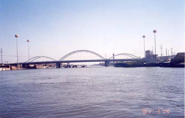 全桥采保用行走于河床上、起重量为30360百科0kN的"贝雷"龙门架吊机翻身、运输和吊装拱片构件。中墩是钻孔灌注桩基础。两岸是U形重力式桥台。1972年8月竣工。
