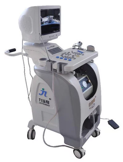 4、开启内窥式流产吸引系统,将带吸引孔道的镜鞘经由宫颈口送入宫腔。调节冷光源亮度,在显示屏上即可清晰观测到孕囊 及周边的蜕膜组织;