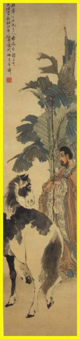 此图右侧画一丛芭蕉,支遁扶杖伫立其下,观赏骏马。马则扬蹄,作昂首回礼状。其画法出自任薰一派,远追陈洪绶的笔调。而马的笔法,又参以任熊、徐渭长的笔致。二者结合,生动自然,这是任颐绘画的高妙所在。画上自署:"铭常仁五兄大人雅属,即请正之。光孔轮于条关朝绪丙子新秋,伯年任颐写于叶践战旧技成海上客齐。"钤"任颐印信长寿"白文印。独写日拿危是他三十七岁所作。