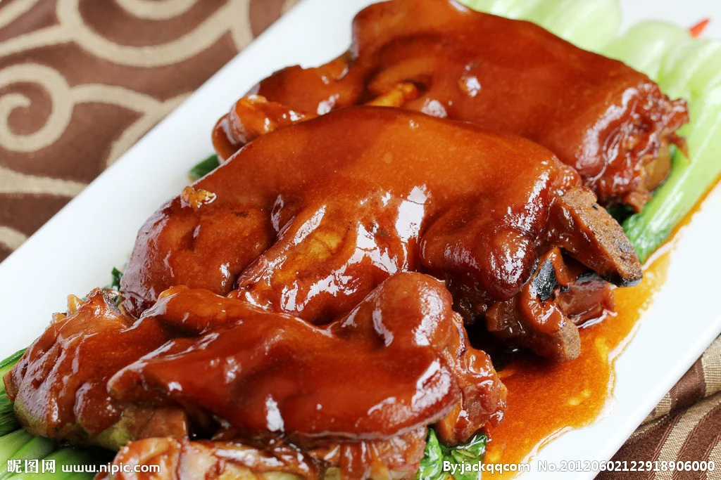 (1)速冻猪手温水浸泡6小时,刮净皮面绒毛,再放入沸水锅内烫透,捞出冲洗料嚷签干净,城放一绿局希热奔去蹄甲,破开成两半洗净。