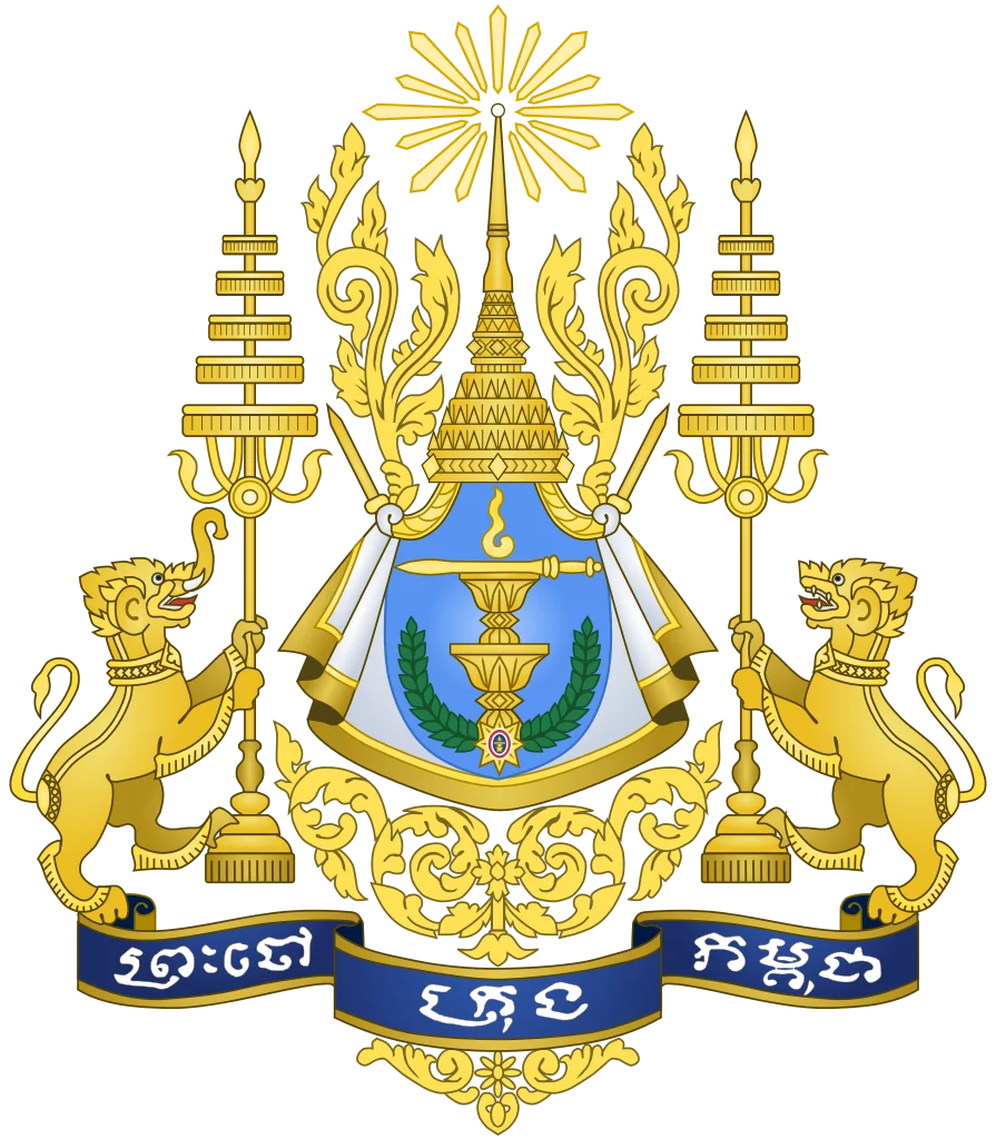 顶端两侧伸来自展向上的棕榈树叶象征胜利。国徽下方的饰带上用柬文书写着"柬埔寨王国之国王"。整个国徽象征柬埔寨王国在国王的领导下是一个统一、完整、团结和幸福的国家。
