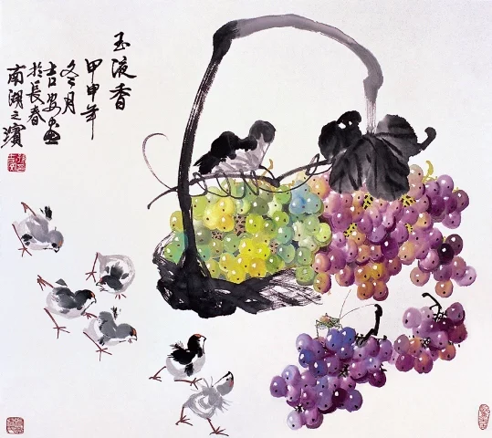 彩墨葡萄在设来自色方面,注重取古法而创新,运用岭南画派的高氏兄弟倡导的"中西艺术调和论",旨在保存中国画笔墨气韵等优势的同时,将西方绘画中的科学技法和色彩原理等引入中国画创作中作以很好的传承。