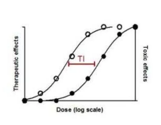 治疗指数(therapeutic index,TI)为药物的安全性指标。通常将半数来自致死量(LD50)与半数有效量(ED50)的比值称为治疗指数。但治疗指数并不能完全反映药物的安全性。