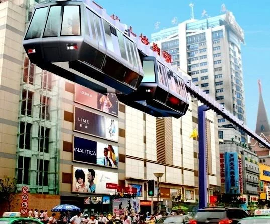 在喧哗热闹的城市上空,在拥挤的高速公路上方,空中轨道列车以每小时50公里的时速,无声息地穿梭而过。不影响视力,经济、快捷、舒适,没有噪音、不污染土地。