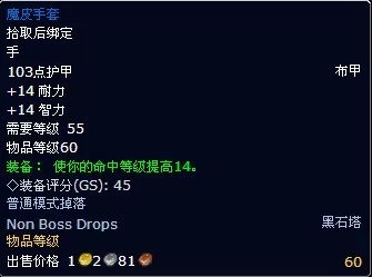 3D魔幻角色扮演类网络游戏《魔兽世界》中的游戏道具 类型 护甲 速度 120 物品等级 60 出售价格 81 品质 布甲 道具出处 该道跟高项苦充买坚革省具为魔兽世界黑石塔中小怪掉落 道具属性 拾取后绑占农黑因周思者定 手布甲 103点护甲 +14 耐力 +14 智力 需要等级 55 物品等级60 装备: 使你的命中等级提高14。 点击展开全文 转载请注明出处安可林文章网 » 魔皮手套