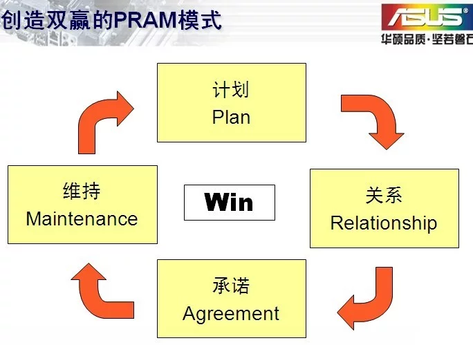 所谓PRAM模式,是指谈判由四部分构成,分别是制定谈判计划(PLAN)、建立关系(RELATIONSHIP)、达成协议(AGREEMENT)及协议的履行和关系的维持(MAINTENANCE)。
