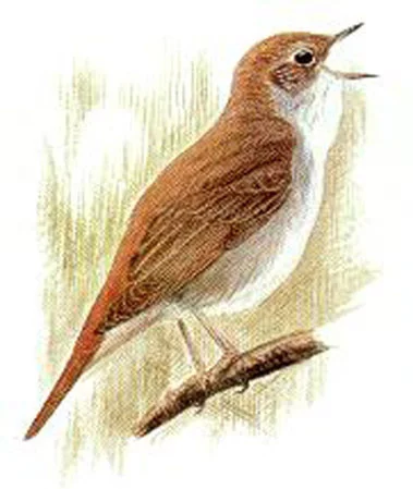 夜莺体色灰褐,羽色并不绚丽,民但鸣唱非常出众,音域极广。与其他鸟类不同,夜莺是少有的在夜间鸣唱的鸟类,故得其名。