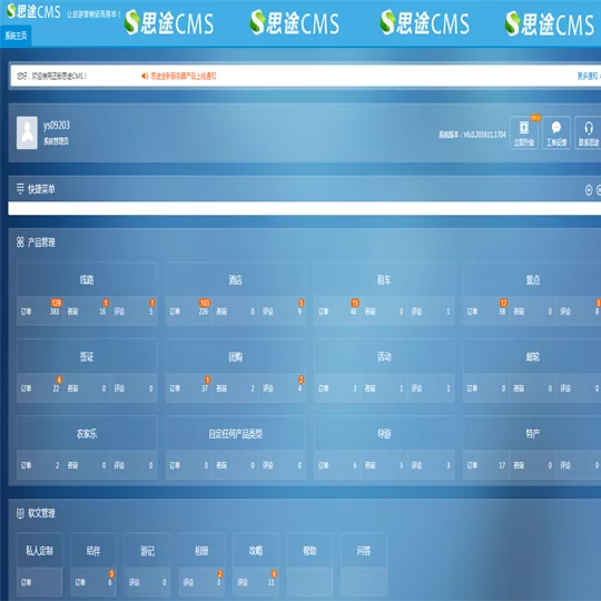 - 思途CMS:适用于旅游行业的CMS系统,由四川思途智旅软件有限公司研发,基于LAMP架构,系统支持O2O模式、B2B模式、B2B2C模式、B2C模式等,其使用价值不限于这些模式在完善的系统基础上将系统的功能及可视化界面进行模块化,用户可根据自己的需求对系统进行模块化的安装使用,如:邮轮模块、供应商模块、分销模块等! 都可进行无限的扩展,具有较强的灵活性,同时支持二次开发,系统无加密,可每周更新,同时也可自行按照官方提供的标准文档进行二次开发!系统嵌入了营销推广系统,营销推广系统包含了来源分析功能,网站地图自动生成,一键设置网页标题、关键词及描述,智能整站检测死链、关键词统计优化功能等。是已有旅游CMS系统的翘楚!同样也是业内 的标杆!