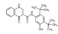KALYDECO 片中活性成分是ivacaftor有下面化学名:N-(2,4-di-tert-butyl-5-hydroxyphenyl)-1,4-dihydro-4oxoquinoline-3-carboxamide. 其分子式是C24H28N2O3和分子量392.49。结构式如下: