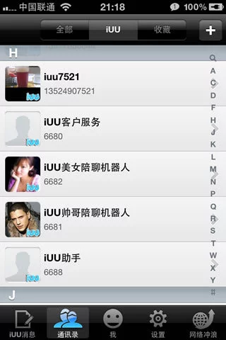 iUU联系人支持首字母识别、支持多选、支持备份到网络和从网络恢复。iUU联系人中有的条目会显示iUU图标,表示此用户已经是iUU用户。没有图标的表示还未加入。他/她也可以享用iUU,无限发短信,发语音,自动更新名片,联系人备份。