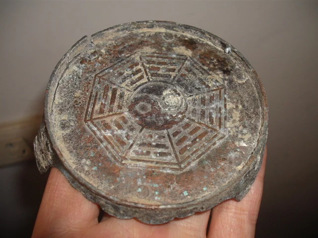 乾隆御制.八卦莲边铜座,是皇宫供仰神象香炉,熏炉之摆座。正面阳铸道敎阴阳八卦图纹式,摆座环衣务刘试兴明候矿常导良周以莲花办吊形装饰,三脚落地.直径九公分有九五至尊之意。