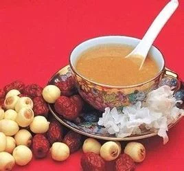 红枣(去核)15克,莲子肉15克,黄豆50克,白糖50克,清水适量