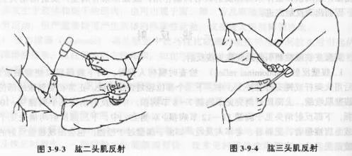 (1)卧位检查法:病人仰卧,前臂半屈,肌肉放松,手置于腹部。检查者以左手拇指按住其肘关节稍上方的肱二头肌肌腱上,然后用右手持叩诊锤叩击此拇指。正常时,即引起前臂屈曲。