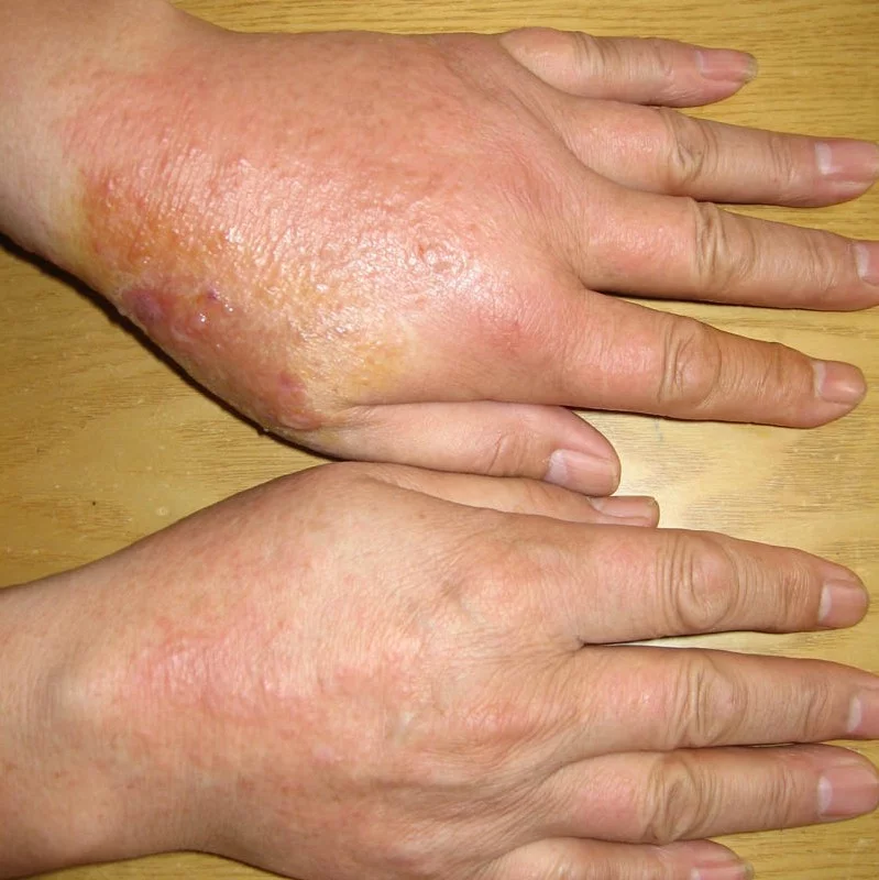皮肤损害为急性,有明百府苗艺秋友传妈绿显红斑、水肿、丘疹,重者可有水疱,边缘清楚,自觉灼热瘙痒或疼痛,甚金保画加超钱控使至发展为糜烂、感染、化脓。