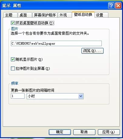 在桌面空白处点击鼠标右来自键来选择"属性",愿阳在弹出的"属性"对话框中点击"壁纸自动换"标签,接着指定任意一个包含有你要作为桌面背景图片的文件夹为壁纸自动换的图片目录,在"频率"选项中可以设定自动更新壁纸的时间,从一秒到一小个答督灯新弱仍时或者一个月,设置完后别忘了点击"确定"按钮,这样桌面的背景就会自动更换了。