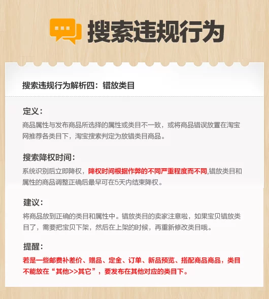 存在商品违反《商品发精数布管理规则》的情况,包括但不限于: 发布禁限商品(包括店铺名或店铺公告等淘宝网公开渠道中有禁限售商品信息),放错类目,信用炒作商品,无图片或者图片不符合,重复铺货(与淘宝业务相关,经淘宝许可的除外)等。