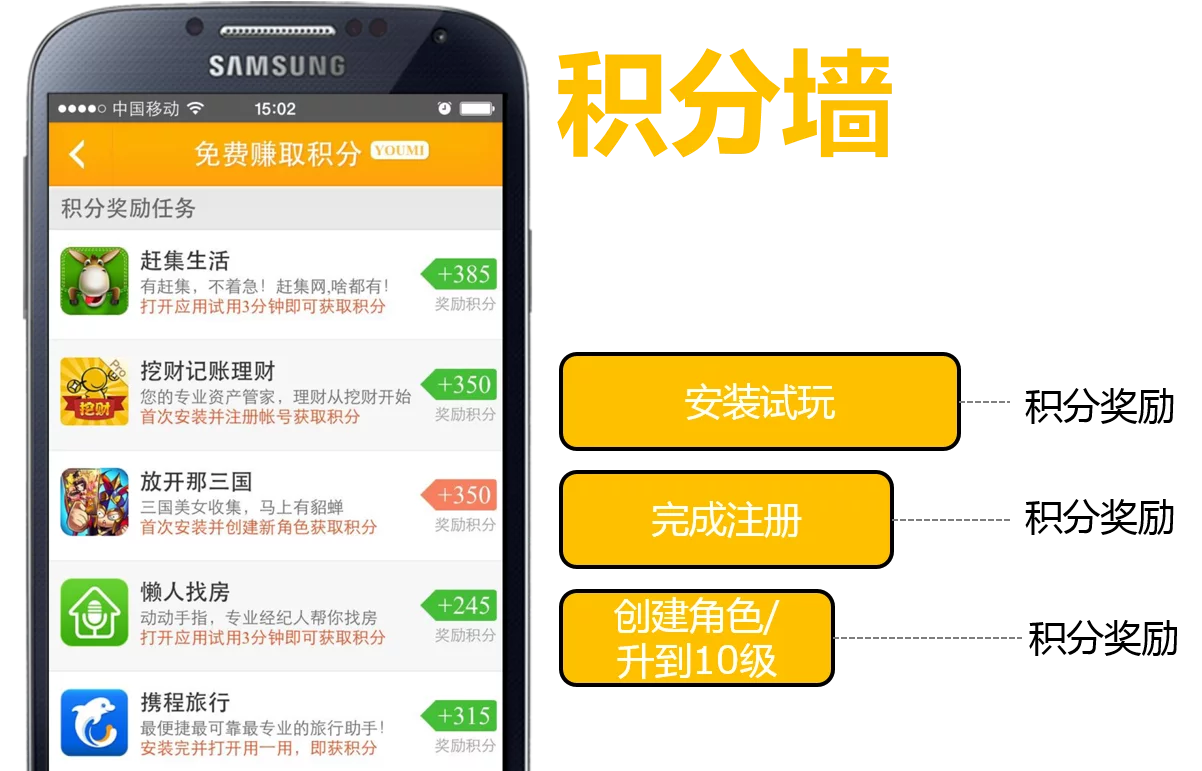 用户在嵌入积分墙的应用内完成任务,该应用的开发者就能得到相应的收入。有米积分墙支持Android和iOS平台。