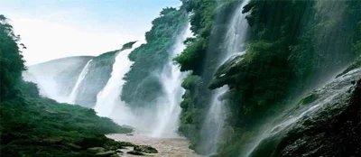其中,以中折瀑最为动人。中折瀑周围的悬崖,有如一个半圆形的洞穴,