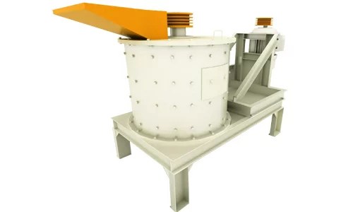 物料由机器上部垂直落入高速旋转的叶轮内,在高速离心力的作用下,与另一部分以伞状形式分流在叶轮四周的物料产生高速撞击与粉碎,物料在互相撞击后,又会在叶轮和机壳之间以物料形成涡流多次的互相撞击、摩擦而粉碎,从下部直通排出,形成闭路多次循环,由筛分设备控制达到所要求的成品粒度。