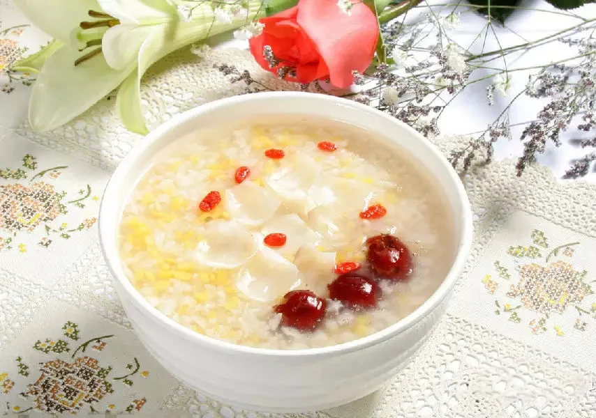 将山药90克,百合40克,大枣15枚、薏苡仁30克及大米适量共煮粥。