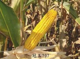 冠玉707是一种玉米,幼苗期第一叶鞘绿色,叶片浅绿色,茎绿色;株高270厘米,穗位高100厘米,果穗圆柱型,穗轴红色,成株可见叶片数16,穗长21厘米,穗粗5厘米,穗行数12~16行,籽粒马齿型,黄色,百粒重43.5克。
