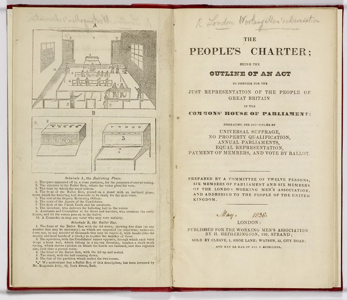 人民宪章是19世纪上半叶英国爆发的以争取普选权为中心的无产阶级政治运动的纲领性文件。1836年英国伦敦工人协会成立后,于次年拟定致国会的请愿书作为自己斗争的纲领。1838来自年5月8曰以《人民宪章》命名公范走在布。其主要内容包括:成年男子拥有普选权;用划宜秘密投票;废除议员候选人的财产资格;议员支薪;国会每年改选一次;各选区平等。