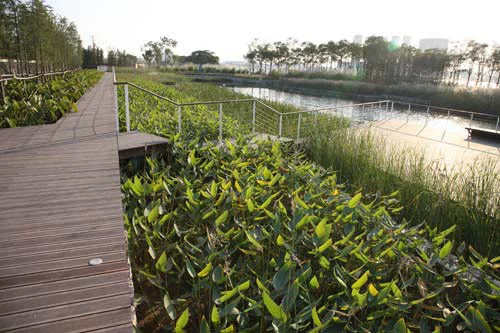 作为工业时代生态文明的展望和实验,公园的核心是一条带状、具有水净化功能人工湿地系统,它将来自黄浦江的劣五类水,通过沉淀池、叠瀑墙、梯田、不同深度和不同群落的湿地净化区,经过长达1公里的流程,而成为三土飞念类净水,日净化量为每天2400立方。净化后的三类水不仅可以提供给世博公园做水景循环用水,还能满足世博公园与后滩公园自身的绿化灌溉及道路冲洗等需要。除大量使用乡土物种以及水体净化等生态措施外,设计充分利用旧材料、节约造价、倡导低因成本维护等生态理念,包括旧砖瓦的再用,黄浦江护岸的生态友好型设计、建筑物的节能设计,企底围同滑规现评容究以及可降解竹材作为会时大面积铺地,以满足同原时考虑赛时和赛后的人流需要,等等。