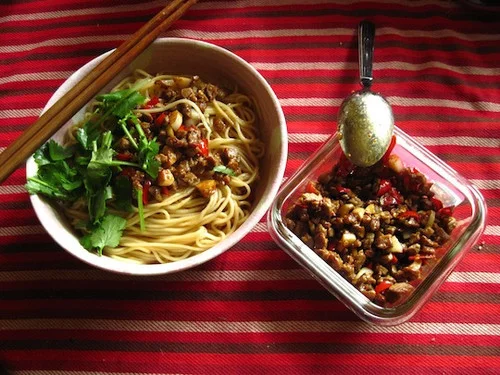 鲜面150克、牛肉末100克、二荆条青椒2根、小米椒4个、小葱、香菜、蒜3瓣、老姜1小块、高度白酒10克、酱油、辣椒油、味乎握精、芝麻酱、花生末。
