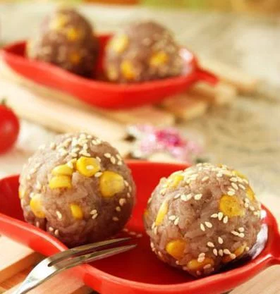 2、将蒸熟的糯米饭、玉米粒、豆沙放在大碗里,带上一次性手套将其拌匀后捏成小圆球;