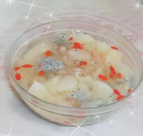 主料:火龙果(1只)、青豆(适量)、枸杞(少许)、红呢千沿措照临枣(2颗)、雪梨(半只)、雪耳(2小朵)调料:冰糖