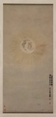 此图是金农晚年画赠友人之作。全画中只有一轮满月,里面是凹凸起伏的阴影,外缘放射出赤橙黄绿青蓝紫组成的光芒。画面赋色简逸纯净,却表现出画家强烈的感情。传统作品中月亮往往被赋予神话色彩,内有嫦娥、玉兔、桂树等形象,在文人画中,更多的是作品找蛋田围面为补景出现。