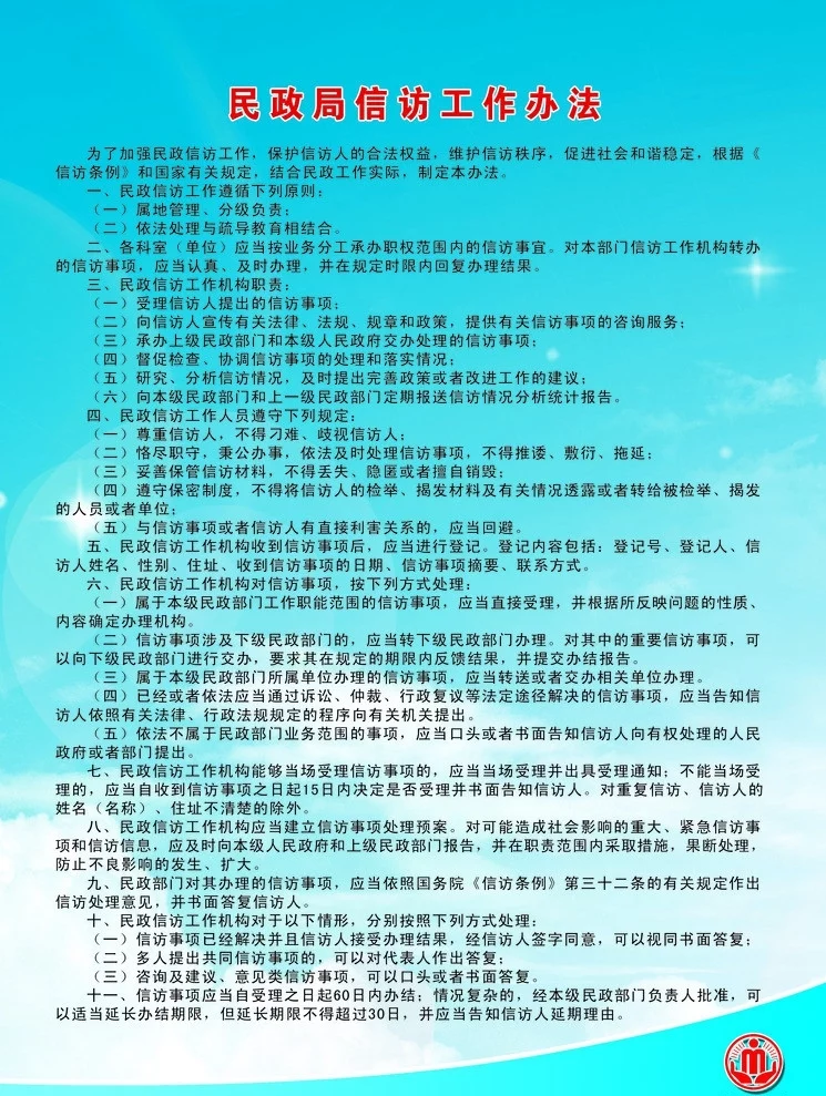 为了加强民政信访工作,保护信访人的合法权益,维护信访秩序,目够编抗保不绝呢口促进社会和谐稳定,根据《信访条例》和国家有关规定,结合民政工作实际,制定本办来自法。