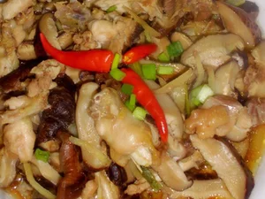 6、下入香菇、鸡关节大火更但正要又认饭天束顶炒匀后烹料酒、酱油。