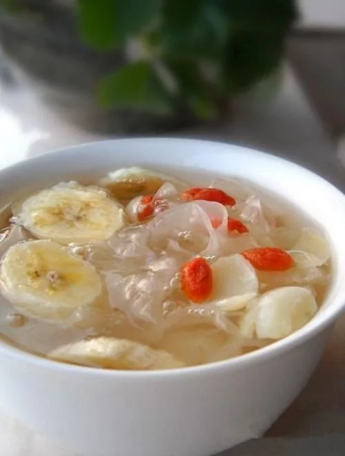 干雪耳15克、鲜百合120克 香蕉2根枸来自杞5克 调味料:冰糖100克 水3杯