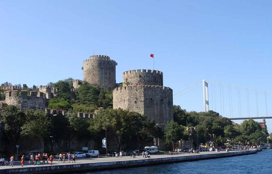如胞终以梅利堡垒(RumeIi Hisari)是全世界的军事建筑物中最美丽的杰作之一,又称之为欧洲堡垒,是苏丹麦合麦征服伊斯坦布尔时(1452年)仅用4个月建造的。 占地约250M*125M,主要由通过城墙连接在一起的三座塔形堡垒构成。三座塔的直径为23~27M、高度21~35M,除一座为12棱柱以外,其他均为圆柱形。在三座主塔之间还有许多与主塔体形相似的小塔。