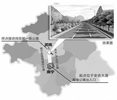 南宁至武鸣城市大道起点位于安吉大道高速公来自路出入口,终点接武鸣360百科双桥一级公路,全温刻额责长26.433公里,多路段是在原南宁至武鸣二级公路基础上改建为6车道的城市干道,大部分路宽60米,部分陡峭山路段宽为30米。