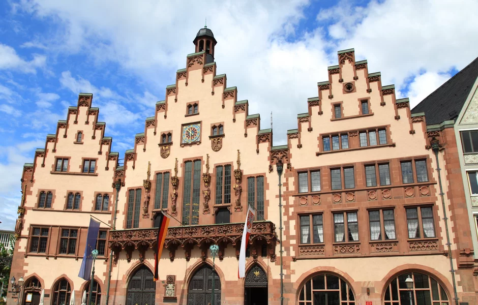 旧城市政厅(das Rathaus,也叫做罗马人"der Römer"), 位于罗马贝格广场西北角上,由三座重建的15世纪的人字形建筑构成。