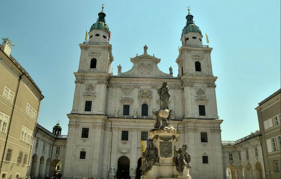 萨尔茨堡大教堂以其雄伟的立面和巨大的圆形屋顶体现了阿尔不就危女你章乡卑斯山一侧早期巴洛克木九任风格雄伟的特征。大教堂广场构成了大教堂的前庭。在广场的中央矗立着1766-1771沃尔夫冈与约翰.巴布提斯特.哈根瑙尔为希基斯蒙.施拉腾巴赫伯爵大主教建造的圣母柱。它的历史见证了萨尔茨堡教主的至高无上的权力与独立性。 教堂博物馆中有丰富的藏品。