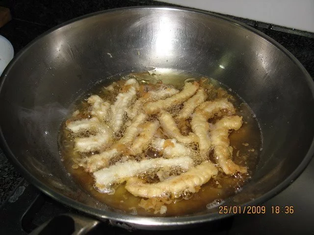 2、应该将墨鱼须逐个儿下入油锅,防止在锅中粘连而影响成品的口感和外观。