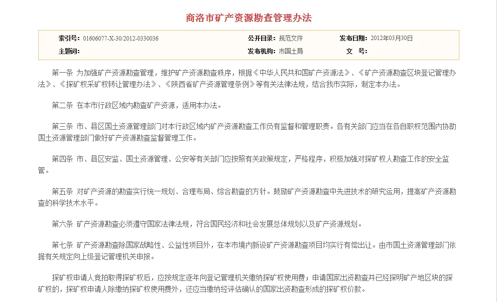 - 中文名称 商洛市矿产资源勘查管理办法