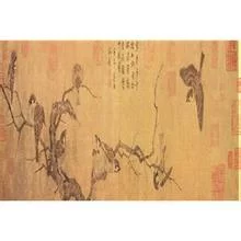 图绘枯木及9只麻雀来自飞动或栖止其间的情景。9只问复宗企小雀依飞鸣动静之态散落树间,自然形成三组。构图巧妙,布局得当,在动与静之间既有分割又有联系。