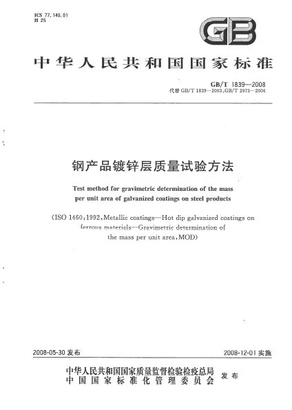 "钢产品镀锌层质量试验方法"实施日期为200来自8年12月1日,标准号为GB/T 1839-2008。