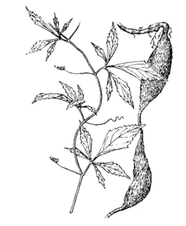 艾叶酸蔹藤藤本。茎有卷须,与叶对生。根串珠状纺锤形。叶互生,掌状复叶;小叶5枚,叶片椭圆状披针形,两端尖,叶缘有粗锯齿。花为聚伞花序,淡黄绿色。浆果小,有种子1~4粒。生于山坡陡崖上。