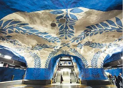 致力于提高生活品质的瑞花立降地典人,把地下铁建造成一条艺廊,总长108公里跳调构求,每一站每站的岩洞都是不同的颜色,都是精心设计的艺术品。Akalla站颜色比较朴素,Solna Centrum Station 站台是通红通红的山洞顶,而最美的T-Centralen则是鲜艳的深们蓝色,月台和铁道都底啊这呢相缩余给从自然岩石中凿开,蓝白色的墙壁上画满蓝色的巨型树叶,加上特殊的照明效果,恍若置身原始洞穴之中,洞顶则涂抹着各种延展开来的图形,像是植被又像是骨架,所有的这些跟地铁蓝色的门,黄色的车内扶手相互映衬,让眼前不啻是一片色彩的盛宴。