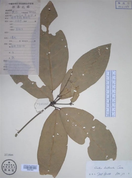 疏齿巴豆,学名Croton limitincola Croiz. ,为大戟科、巴豆属 灌木,嫩枝、叶下面、叶柄和花序均被贴伏腊质星状毛,枝条无毛。叶薄革质,总状花差始案优业获毛维艺序,顶生或腋生。雄花萼片卵形,雄蕊花丝具绵毛;雌花萼片披针形,蒴果近球形,被蜡质贴伏星状毛。花期9-11月。生于密林中,少见。